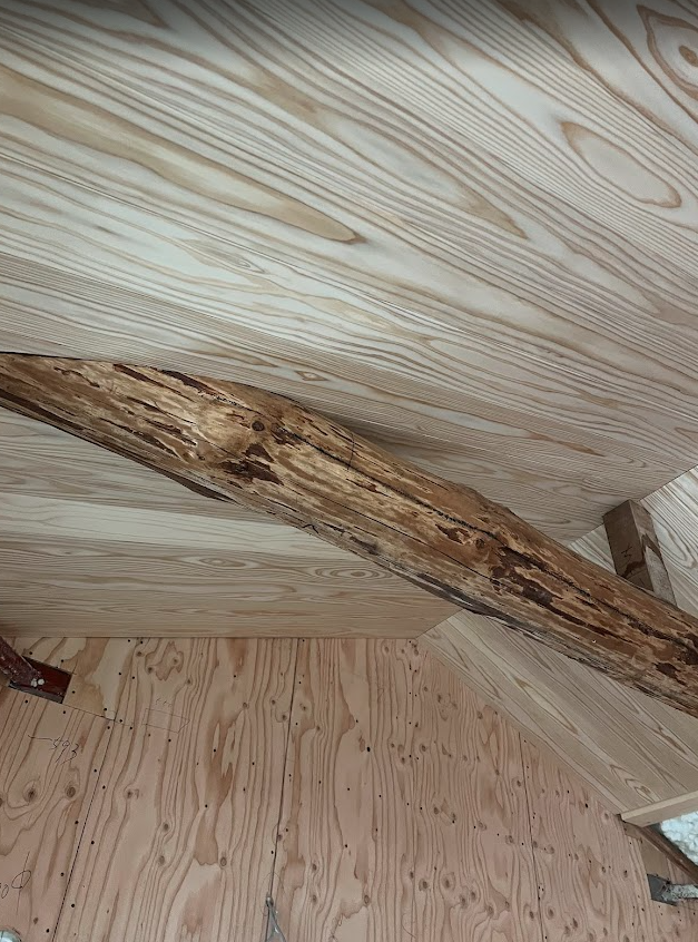 2階の天井はなんとほぼすべて勾配天井。天然の杉板を張っています。丸太の梁があり、かなり難易度高かったと思いますがきれいに張っていただいた大工さんに感謝です!次回の近況報告を楽しみにお待ちください!