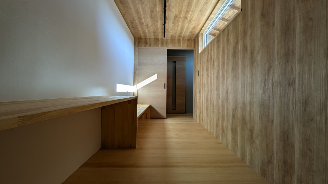 今回の事例は、壁と天井を木目クロスで仕上げた回廊空間。