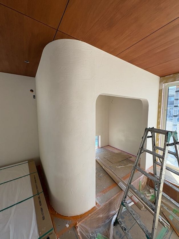 このR壁はただの仕上げではなく、空間に余白と呼吸を与える存在として設計段階から大切に考えました。
