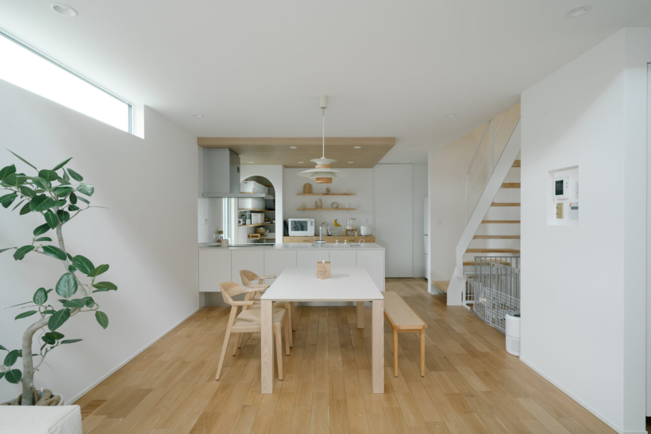 白い左官壁やアールのやわらかさに対して、