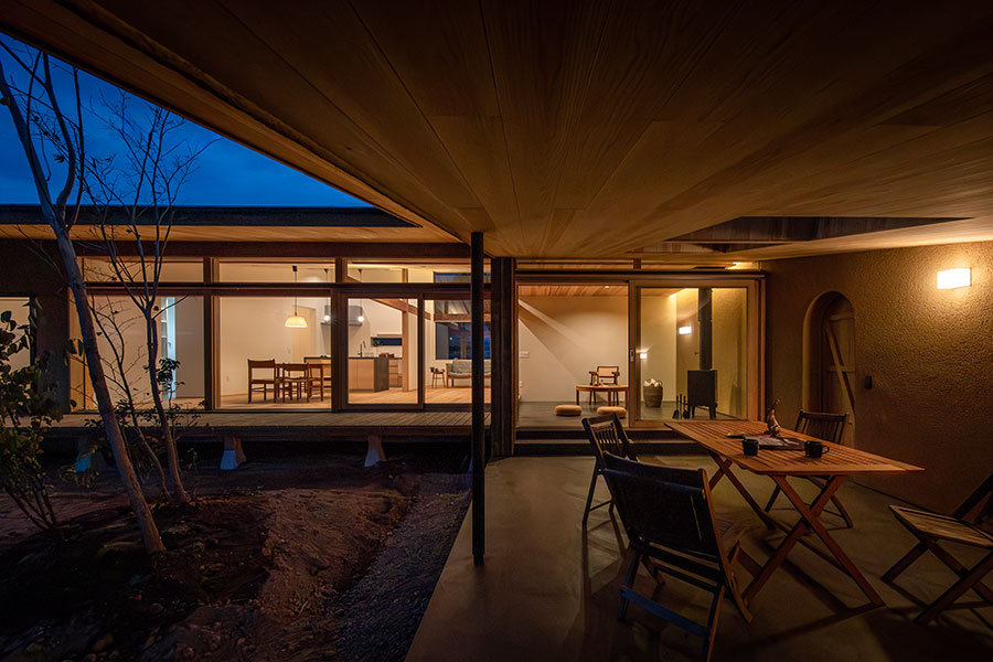 AARDEとは「土」。人は、原初の素材の一つである土と、縄文の頃から共に生きてきた。土にうずくまるように。土に抱かれるように。遺伝子レベルで私たちに刻まれたその「土間」への敬慕とも言える感情に、AARDEは応える。どこか大地へ還っていくような、特徴的なプロポーションの外観。黒モルタルで仕上げられた内部の土間。AARDEに住んで、土間に薪ストーブを置いて、夜の帳の下で火を焚いてみて欲しい。原初の「火の間」が、あなたの遺伝子を震わす情景を立ち上げてくれる。
