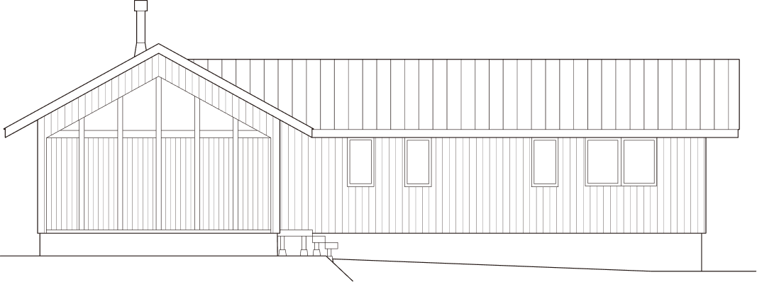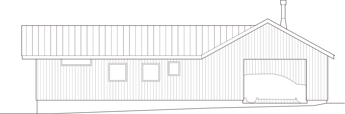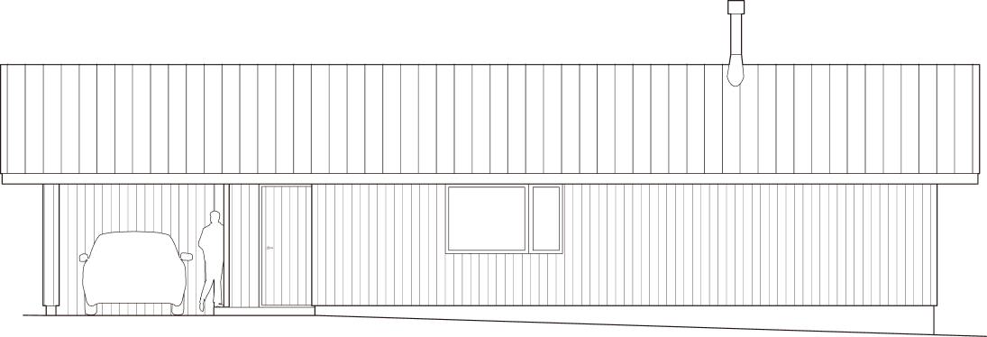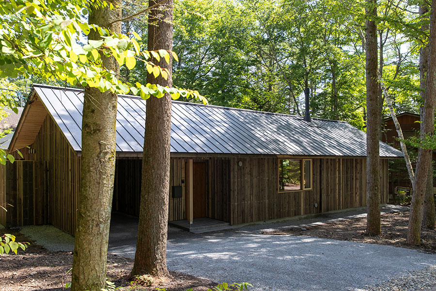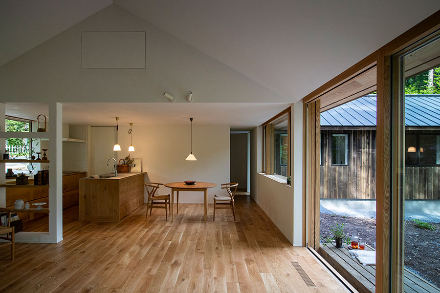 インナーガレージ付きL字型3LDKプラン。LDKと寝室棟に分かれたL字の躯体が、庭先を優しく抱き込む。LDKからは大型ガラス面を通してデッキが広がる。デッキは屋根とルーバー壁によって風雨と視線から守られ、四季を通して自然と家族を繋ぐ「安らぎの場」を生み出している。LDK棟から離れた主寝室は、緑茂る庭と、そこに平行するLDK棟の美しいプロポーションを臨む。※規格住宅ではありません