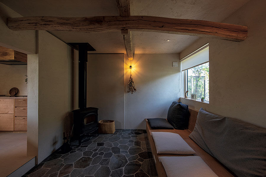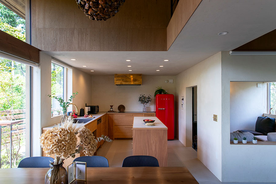 HUIZEN HUISJE 3LDKプランの1つ。元来、宿泊施設として計画されたプラン。性質上必要であった広い玄関土間収納は使い易さの観点からそのまま踏襲された。1階部分は4つのゾーニング(スクリーンルーム、リビング、ダイニング、キッチン)に分けられており、それぞれ全く異なる素材感、窓のスケール、そして天井高を持つ。各エリア、各アクティビティが、互いに存在感を主張し合いながらも、適度な間合いを取り、共存している。いつまでたっても飽きのこない、毎日を満喫させてくれる住まい。※規格住宅ではありません